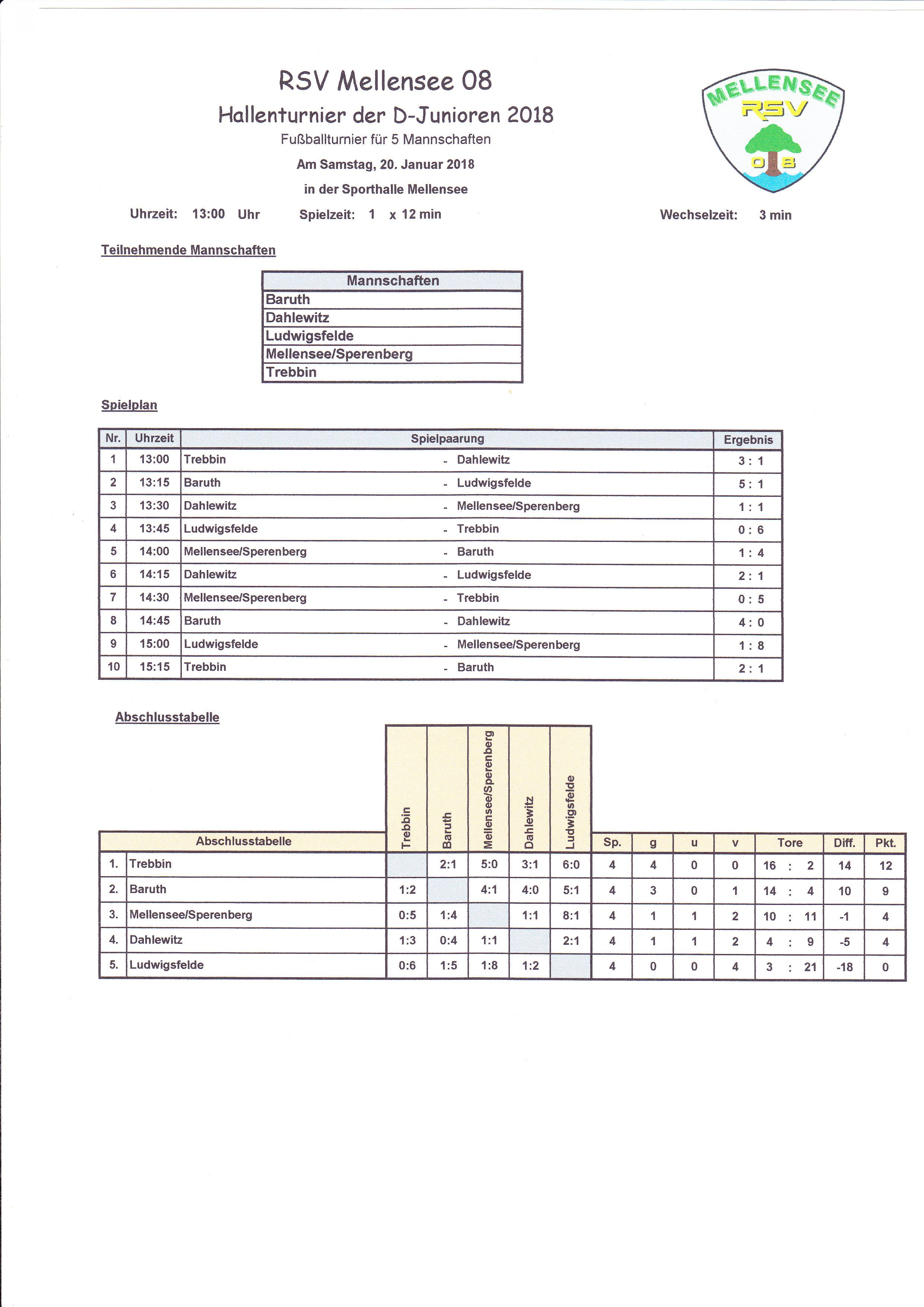 Mit zwei spannenden Turnieren, der E- und D- Junioren, begannen die Einladungsturniere des RSV Mellensee 08 in der Mehrzweckhalle am 20.01.2018.